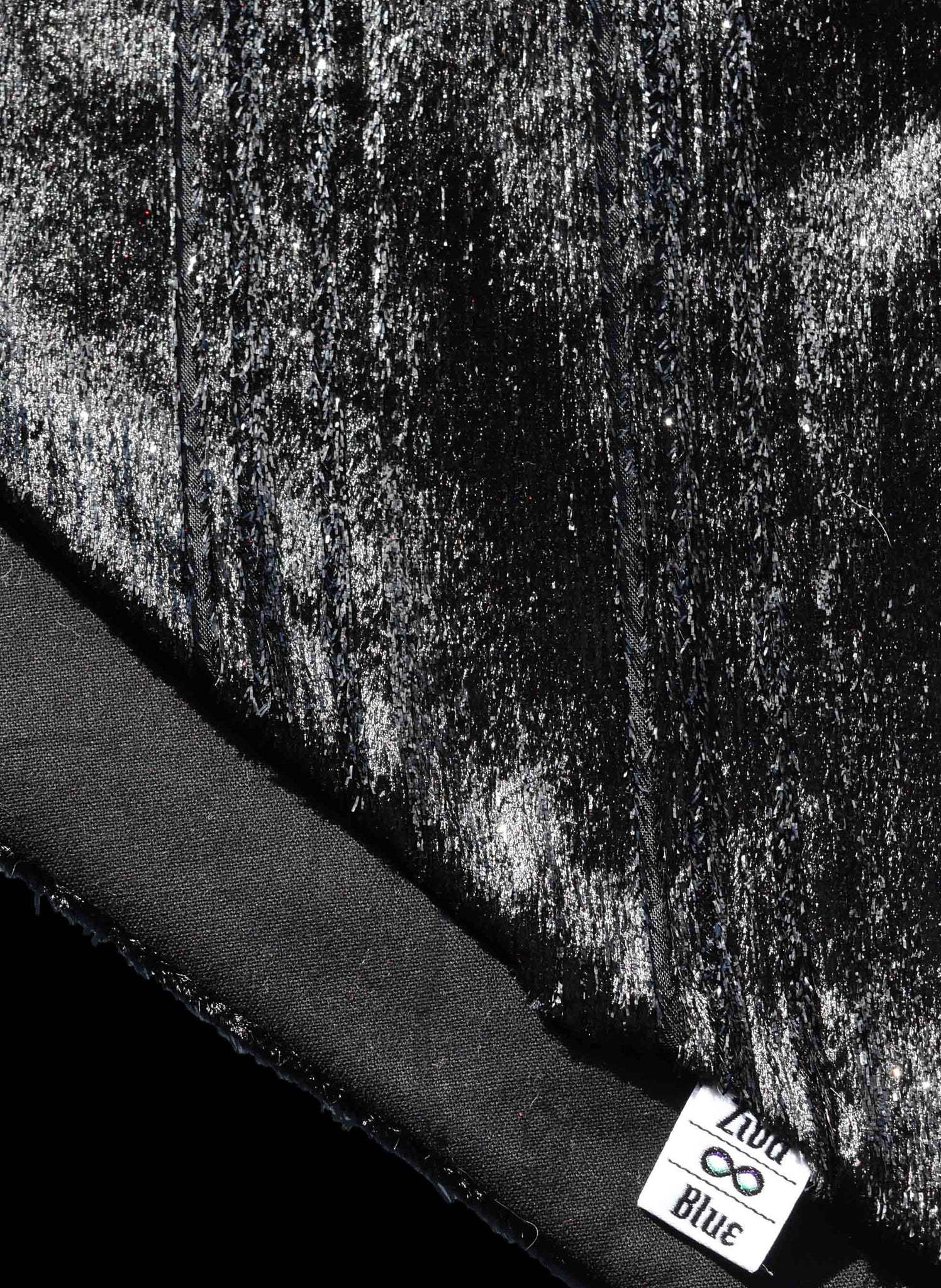 This particular design is made from a light shiny black fur textured fabric.  Special care is needed to keep it looking good.
